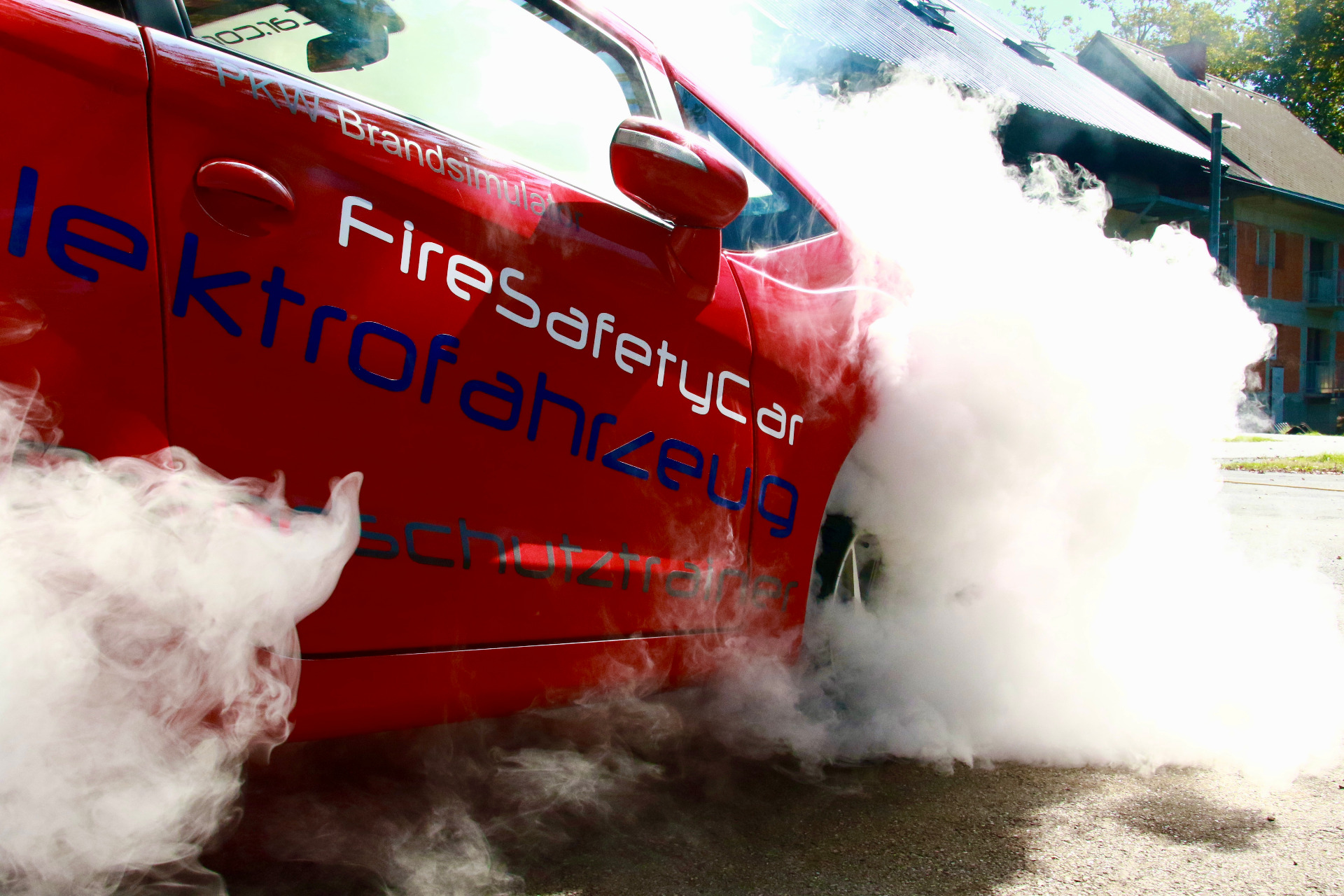 - Szenario 1 / Annahme; Brandentstehung an der Hochvoltbatterie. Beginnend vom ausdampfen und langsamer Ausbreitung bis zu heftigen Reaktionen starker Qualmbildung mit dem leistungsfähigen Firefog® Kunstrauch sowie elektrisch erzeugten Flammeneffekten.